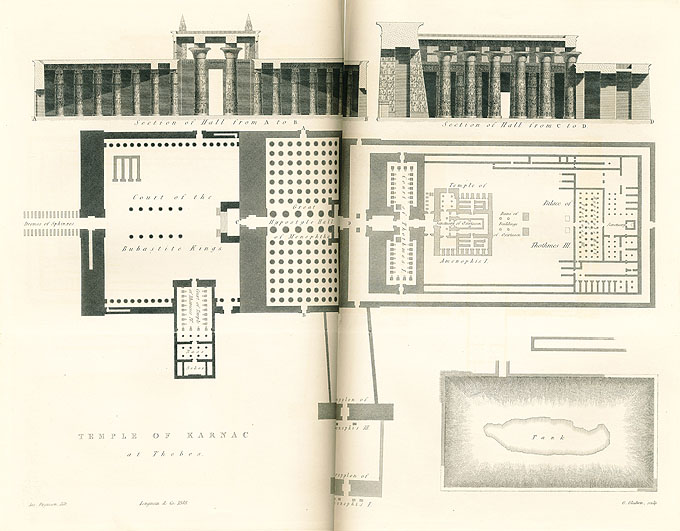 ジェイムズ・ファーガスンの『歴史的探究』の図版。 銅版画(エッチング)による、テーベ(現在のルクソール)のカルナック大神殿。 見開き2ページの大きな銅版画(27cm× 36cm)で、文字はすべて活字ではなく手彫り。 裏面に何も印刷されていないオリジナルの版画を、図版として組み込んでいる。