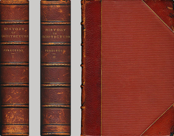 ジェイムズ・ファーガスンの『世界建築史』初版、上下巻、自家装幀の背と表紙 (1865, 1867)