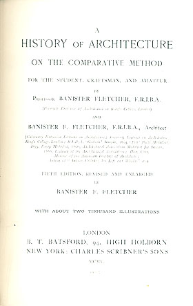 『フレッチャー建築史』 第5版 (1905) 。 扉ページ と、その2ページ前にある「建築の樹」図。 『フレッチャー建築史』 第5版。 最初に出てくる図版ページ「先史時代の建築」(p.2-3)。 『フレッチャア建築史』第5版 ローマの聖ピエトロ大聖堂(p.468-9)。 『フレッチャー建築史』 第5版。 左は「インド建築の実例」(p.609)、右は「中国と日本建築の実例」(p.643)。