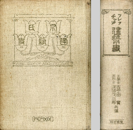 バニスター・フレッチャーの 『フレッチャア建築史』 第5版の邦訳版 (1919) の背と表紙。今から 90年ほど前の 岩波書店の版元装幀で、背と平とも素地のキャンバス装に、図案化したタイトルが 金で箔押しされている。天金(てんきん)。他の小口も カットして切りそろえてある。(当時、大倉書店や岩波書店から出た 夏目漱石の本は、ほとんどが 天金で アンカット本だった。)