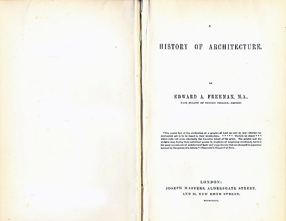 エドワード・A・フリーマンの『フリ-マン建築史』初版の背と表紙 (1849) 版元装幀で、青紫色の布装。 『フリーマン建築史』の扉ページ。左ページに、フロンティスピースとして、 イギリスの地方の教区聖堂の絵が貼ってあったらしいが、 私の所蔵する本では失われている(それが、唯一の図版であった)。 『フリーマン建築史』序論の扉ページ。 左は目次の最終ページ。