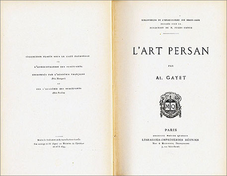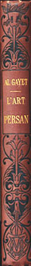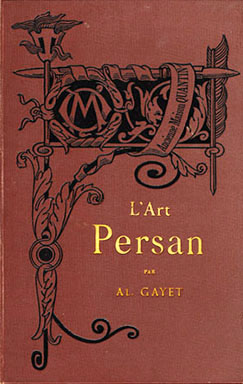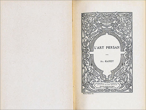 アルベール・ガイェの 『ペルシア美術』 の表紙と背 (1895) 版元装幀の 茶紫色布表紙。 「美術教育叢書」に共通の表紙なので、 金文字箔押しの書名と著者名以外は、どの巻もまったく同じ装幀。 『ペルシア美術』 の前扉 これも叢書に共通のデザインなので、他の巻とは書名、著者名のみが違う。 『ペルシア美術』の本扉