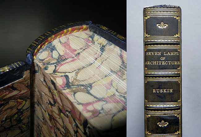 ジョン・ラスキンの 『建築の七灯』 1911年版の背表紙と天端部詳細。