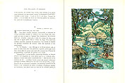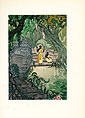 さて、この『アンコール詣で』の挿絵本は、3種が知られています。 私が所有するのは、カルマン・レヴィ社から出版された、モーリス・ラロによる挿絵本で、一番普及しているものです(他の2点は少々高価、特にフランスワ・ルイ・シュミードのものは 値が張ります)。そして 前に紹介したアンドレ・マルチの挿絵による『青い鳥』と同じく、革製本する前の 仮綴じ本(ブロシェ)、日本で言う「フランス装」の本で、今から 75年前に出版された 古書です。モーリス・ラロについて 詳しいことは わかりませんが、フランスの画家で、多くの挿絵本を残しています。最高の画家とは言い難いですが、どんなテーマでも 種々の画風でこなす才覚を もっていたようです。 この『アンコール詣で』は 短編小説なのに、古書店から届いた時に包みをあけてみたら、『青い鳥』の2倍ちかいヴォリュームがあるのに 驚いたのを 覚えています。『アンコール詣で』の 1.5倍の長さがある『死と哀憐の書』(ピエール・ロチ著、初版は1890年、カルマン・レヴィ社)と合わせた一巻だからです。しかし表紙のタイトルには、『アンコール詣で』しか書いてありません。 挿絵は どちらも モーリス・ラロが ポシュワールの技法で描いていて、1ページ大のものは『アンコール詣で』に7点、『死と哀憐の書』に6点で、計 13点のほかに、各短編の冒頭に 小挿絵(ヴィニェット)が添えられています(全部で 11点)。ポシュワールの挿絵は2色刷りと多色刷りがあり、多色刷りのものには、パラフィン紙のカバーが かけられています。私が一番好きなのは、『アンコール詣で』の最後の挿絵で、石の尊顔彫刻が ジャングルの中の沼のほとりで、現地人を眺めているようなシーンです。