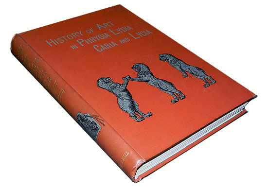 私が所有しているのは、この内の ただ1冊、今からちょうど 120年前に出版された、5-B の『フリュギア、リュディア、カリア、リュキアの美術の歴史 』です。ペルシア編と合わさった仏語版の極厚本よりは、ずっと扱いやすい厚さの版と言えます。そして仏語版は 革装のクラシックな装幀でしたが、英語版はバックラムのような 布装で、ずっとモダーンな装幀となっています。豪華さは、もちろん仏語版が上で、小口は三方とも金になっていますが、英語版は天金もなく、三方ともアンカット本でした。