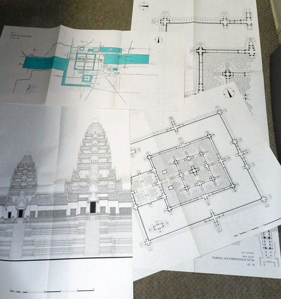 フランス極東学院『アンコール・ワット図面集』 数枚の図面を広げたところ。