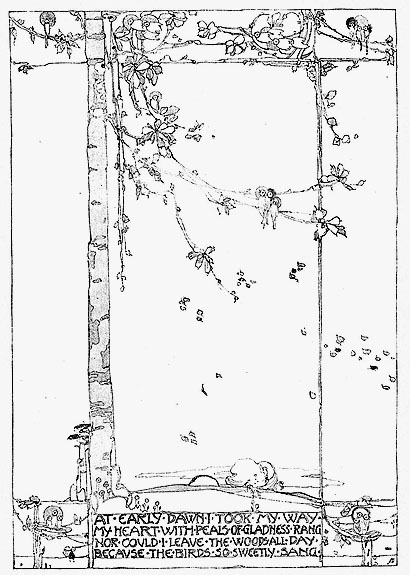 パーセル・アンド・エルムスリーの便箋(左)と、ジェシー・M・キングの挿絵(右) 左は幾何学紋、右は植物紋であるが、全体の感覚的印象は きわめてよく似ている。 左は幾何学であっても「有機的な」造型であって、しかも手描きのフリーハンドの線であること、 右は人物がいず、植物であっても幹や枝を幾何学的な図案にしていること、などによる。