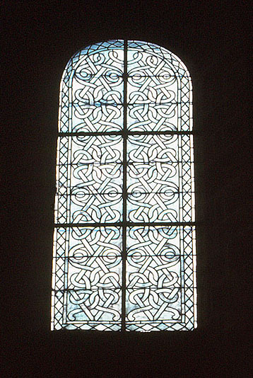 ほとんど色彩のない、組み紐紋様だけの、シトー会に典型的なステンドグラス。