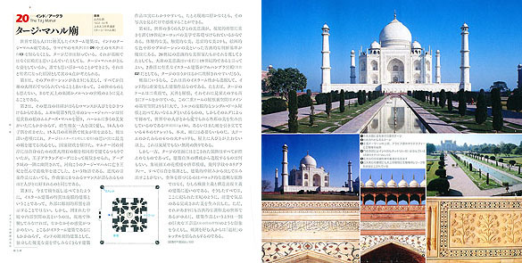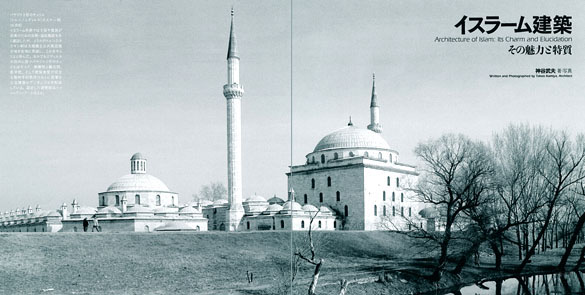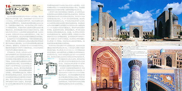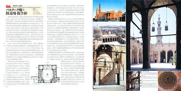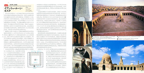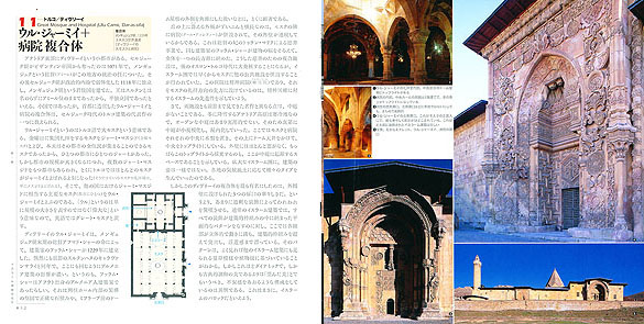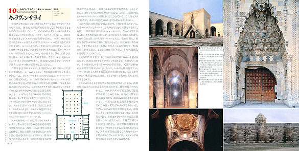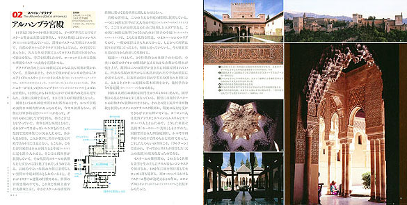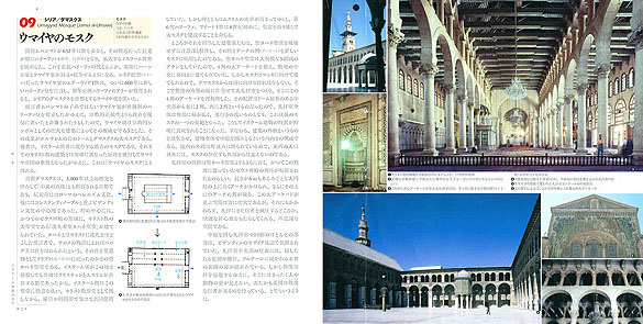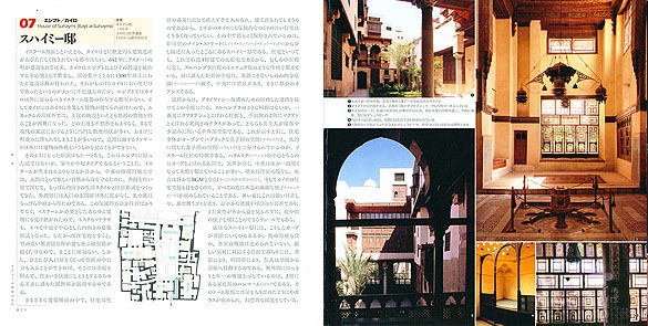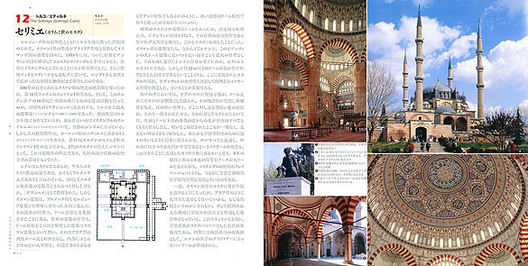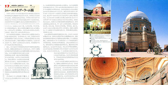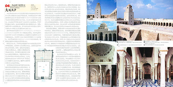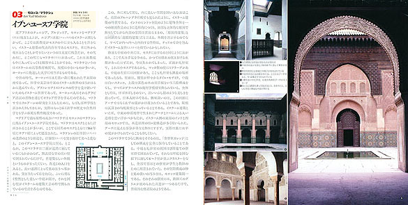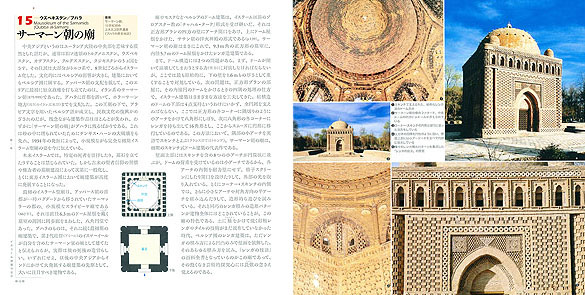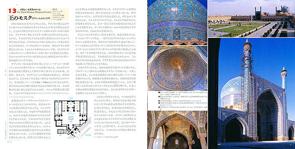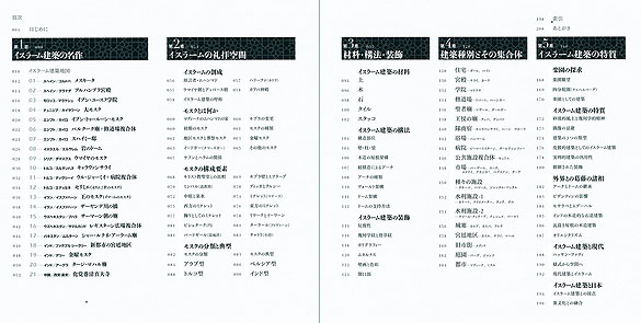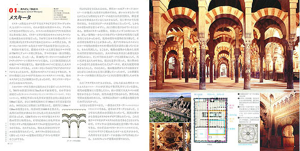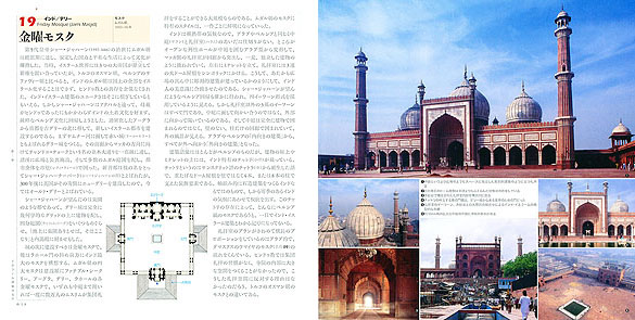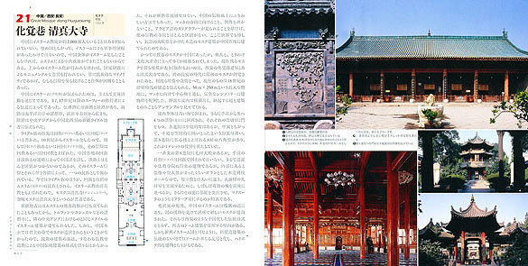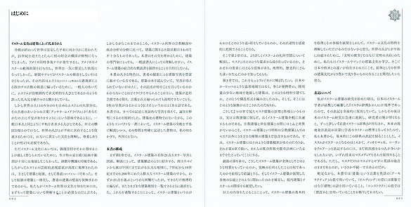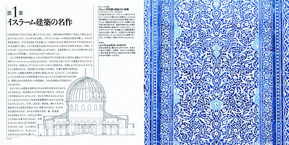 まず第1章では、イスラーム建築の名作 21点を カラー写真と図面、解説によって、建築雑誌のように紹介する。 西はスペインから 東は中国にまで広がる広大な地域に、7世紀から 19世紀までの 1,200年にわたる膨大なイスラーム建築の中から、わずか 21点を選ぶというのも困難だったが、できるだけ地理的に偏らず、また さまざまな建築種別を一覧できるように選択をした。 これらを通覧することによって、イスラーム建築というのが おおよそどのような姿・形をしているものか、その共通性を 感覚的に把握できることだろう。
