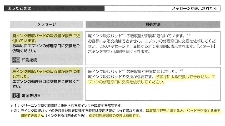 廃インクパッドに関するメッセ-ジと、その対処方法。