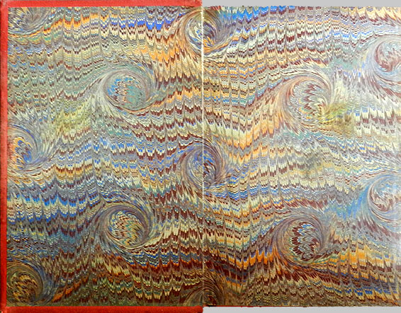 見返しには、細かい櫛目模様の、かなり派手なマーブル紙を使っている。