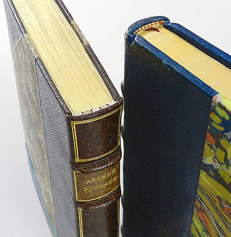 上部詳細。 背革と 背バンド、天金と 手編みの花切れ。