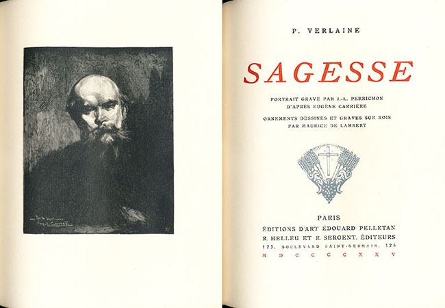 ポール・ヴェルレ-ヌの詩集『叡智(サジェス)』1925年版の 本扉とフロンティスピス(口絵)。