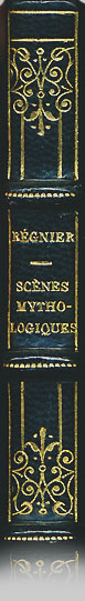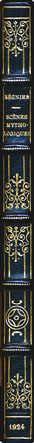 <右> 背表紙の上半分 5本の背バンドには点線、 2番目の区画にはタイトルを、他の区画には繊細な装飾を、上から下まで 金で箔押ししている。
