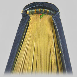 <上> 天小口 天金をほどこし、 3色の絹糸を手編みした花ぎれ、同じく3色の しおり紐(スピン)をつける。背革の天端を 花ぎれにかぶせるように水平に曲げることによって、ここに指をかけても壊れないように強度をもたせている。その左右には 表紙を開きやすくするための 凹み(切り込み)を上下につけている。