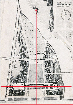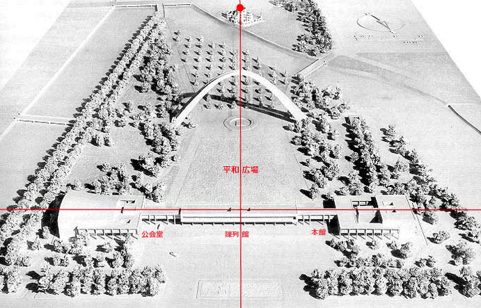 原爆ドームから平和大通りに直角に軸線をもうけ、すべての施設を その軸線上に シンメトリーに配置した。