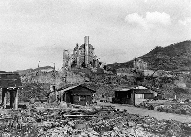 『長崎 原爆投下』、米軍撮影(From Asahi Com.) 爆心地の 浦上天主堂付近。数軒のバラックが立っている。1945年8月