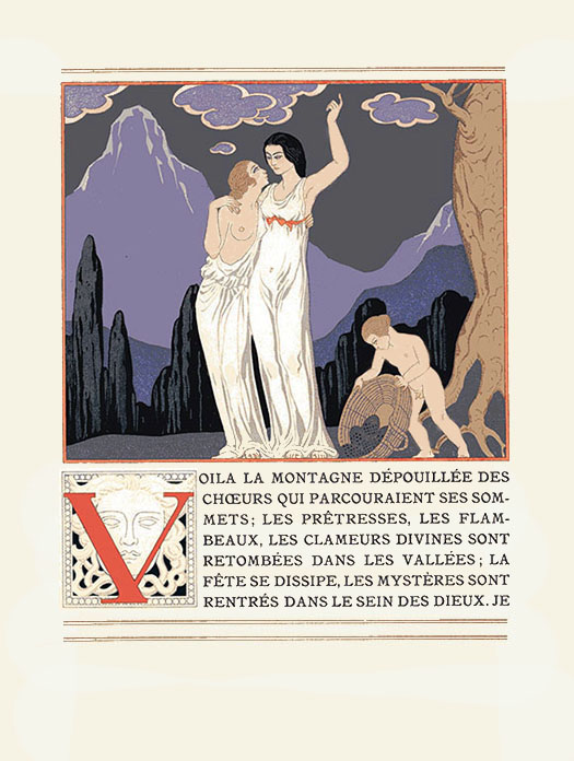 『モーリス・ド・ゲランの散文詩』「バッカスの巫女」の5ページ目。 ジョルジュ・バルビエの原画による木版画の挿絵と、レトリーヌ V 二つ折りのページの大きさは 25cm × 20cm。 絵は、若いバッカーント(語り手)と、先輩であり 師である巫女・アエロー。 ブドウの房を収穫する (?) 子供は、幼時のバッカスか?