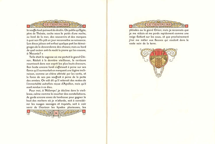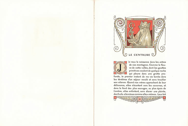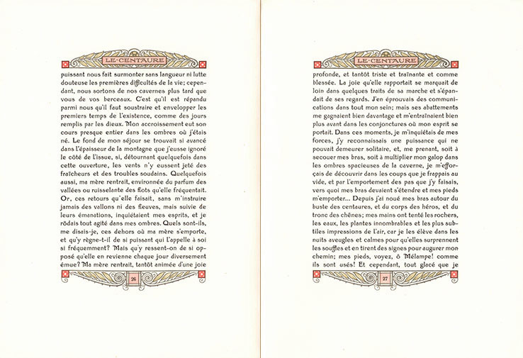 モーリス・ド・ゲラン 「ケンタウロス」の 口絵(フロンティスピス) 1ペ-ジの大きさは 26cm x 19cm モーリス・ド・ゲラン 「ケンタウロス」の 冒頭ページ モーリス・ド・ゲラン 「ケンタウロス」の 本文ページ pp.23 ~40 モーリス・ド・ゲラン 「ケンタウロス」の 最終ページ ジラルドンによる挿絵