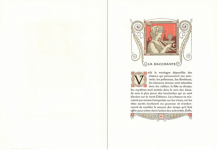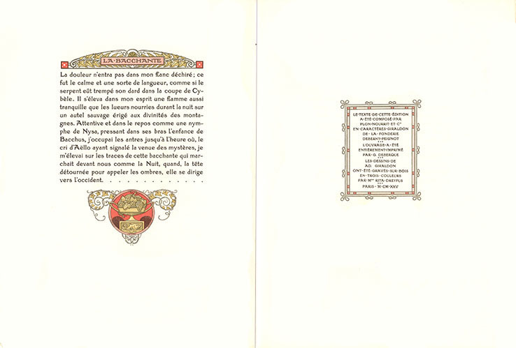 モーリス・ド・ゲラン 「バッカスの巫女」の 口絵(フロンティスピス) 1ペ-ジの大きさは 26cm x 19cm モーリス・ド・ゲラン 「 バッカスの巫女」の 冒頭ページ モーリス・ド・ゲラン 「バッカスの巫女」の 本文ページ pp.41 ~62 モーリス・ド・ゲラン 「 バッカスの巫女」の 最終ページ ジラルドンによる挿絵