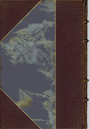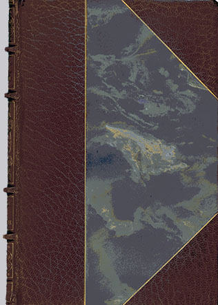 焦げ茶色のモロッコ革によるハーフ・レザー。平はマーブル紙。