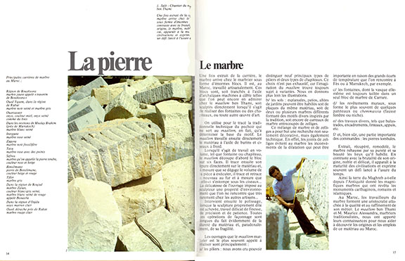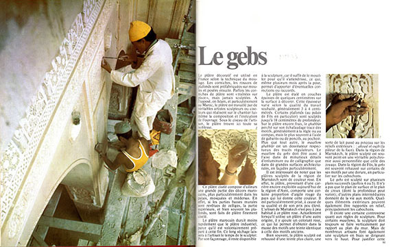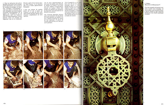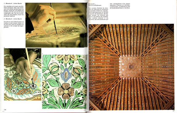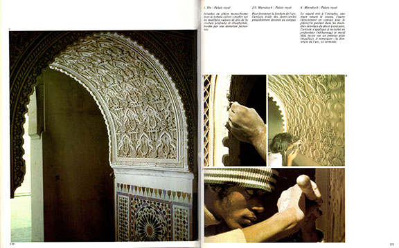モロッコの建築工芸というのが、いかに繊細で美しいものか(ウェブ上で解像度が低い図版なので、十分とはいえませんが)わかるでしょう。こうした建築装飾がいかに作られるものかを、単に最終結果だけでなく そのプロセスを、大量のカラー写真を用いて 微に入り細を穿って描き出したのが この本です。