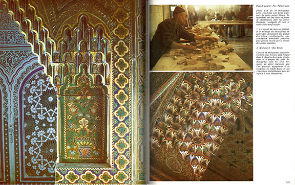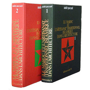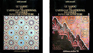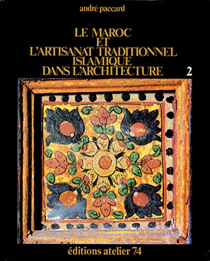 原題は "LE MAROC ET L'ARTISANAT TRADITIONEL ISLAMIQUE DANS L'ARCHITECTURE" なので「モロッコと、建築におけるイスラームの伝統的職人芸」といった意味ですが、本稿では端的に『 モロッコの建築装飾 』としておきます。私が翻訳出版するとしたら、こういう邦題にしたであろうし、イスラーム建築における伝統的職人芸は 現代までも続いていて、宗教建築ばかりでなく、現代の王家の廟から 銀行建築にまで適用されているからです。 これは モロッコの建築工芸を調査した 貴重かつ大部の書で、仏 アカデミー・フランセーズの金メダルを受賞しました。 イスラームの建築装飾を 詳細かつ立体的に紹介した空前絶後の書で、技法や材料ごとに、現代まで続く生きた建築装飾を、カラー写真を駆使して各工芸家の製作プロセスを追いながら詳細に示しています。 イスラーム美術愛好者の垂涎の書です。 本文はフランス語ですが、英訳版もあります。英語版は 1980年に メアリ・グッゲンハイムの訳で, "Traditional Islamic Craft in Moroccan Archirtecture" 「モロッコ建築における伝統的イスラーム工芸」という題で 一度だけ出版されました。イギリスやアメリカの出版社が大々的に出したわけではなく、もとのフランスの「アトリエ74」が出しただけのようなので、これも入手困難になっているようです。