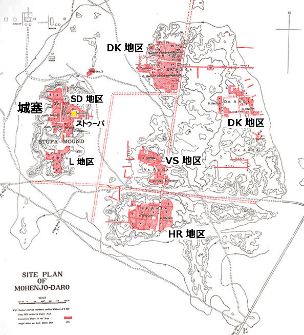 モヘンジョダーロ都市遺跡の 発掘地図 発掘がおこなわれた部分が赤で示され、他は手つかずの状態。 (From "Further Excavations at Mohenjo-Daro" by E.J.H. Mackay, 1938, Delhi)