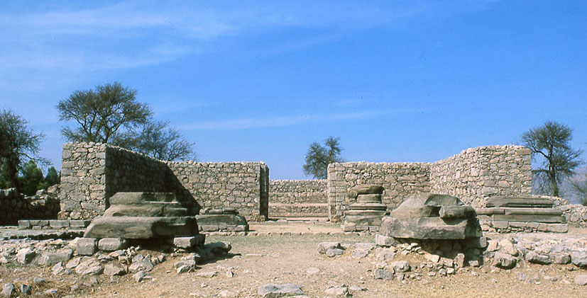 シルカプとシルスフのあいだにあるジャンディアール寺院 ギリシア神殿風の平面形をしていて、全体は矩形の厚い壁で囲まれ、内部にはナオス(聖室)と プロナオス(前室)があり、その手前の入り口部に 4本の円柱が立っていた。 柱身は失われ、発掘されたイオニア式の柱頭が、柱脚の上に置かれている。