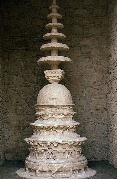 モフラ・モラードゥの僧院の一室に安置されている 奉献ストゥーパ 高さが3.6メートルある大型のもので、初期の 土饅頭(どまんじゅう)型のストゥーパに 比べると 垂直性が高まり、傘蓋(さんがい)が肥大化している。(1978年1月撮影)