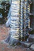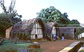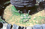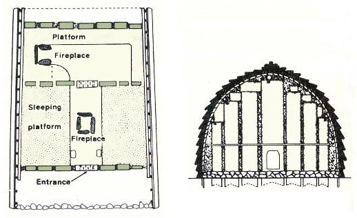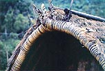 しかし現地調査をした結果は、その否定であった。端部のアーチは、藁や草を束ねて 籐でぐるぐる巻きにしたもので(だからこそ アーチ状に曲げることができる)、これは主構造ではなく、造形的な飾りに過ぎない。主構造は妻壁であって、これはきわめて厚い木の板を 掘っ立て柱のように地面に差し込んで立てる。