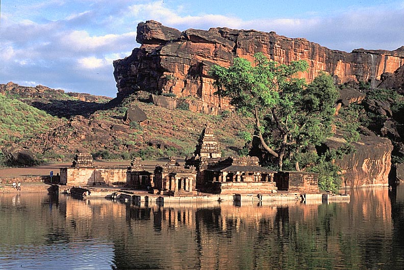 夕陽に輝くブータナータ寺院、7世紀、バーダーミ