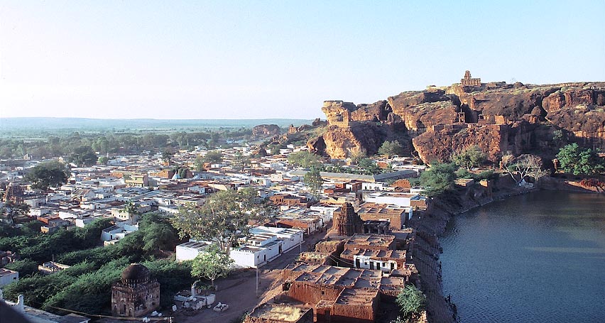 赤砂岩の北山と人造湖に面するバーダーミの町。