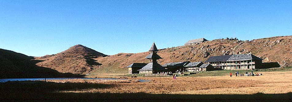 パラ-シャル湖のほとりに建つ、木造のパラ-シャル・リシ寺院と付属施設
