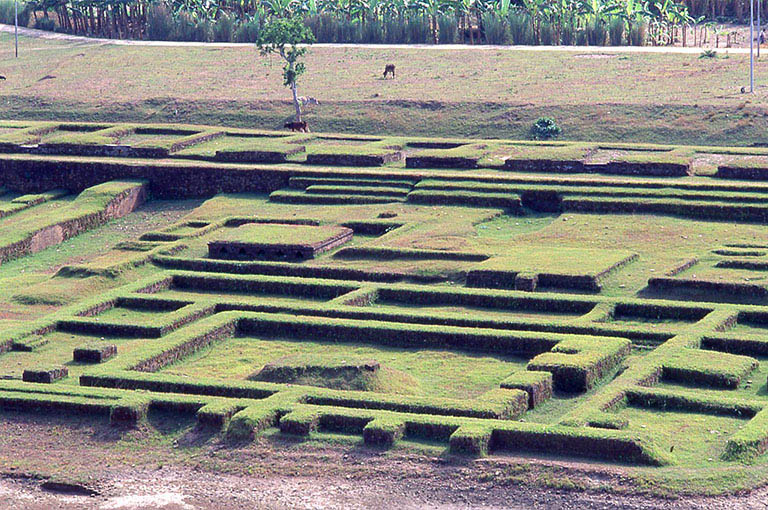 パハ-ルプルの ソ-マプラ大僧院の境内(平面図の上方、赤線で囲まれたあたり) 大祠堂の上から境内の東側を見下ろす。 177もの僧室群で囲まれていた広大な中庭には、 さまざまな堂塔や施設の土台が、幾何学的なパターンを描いている。 写真上方に 横一列に並んでいるのが 僧室群である。