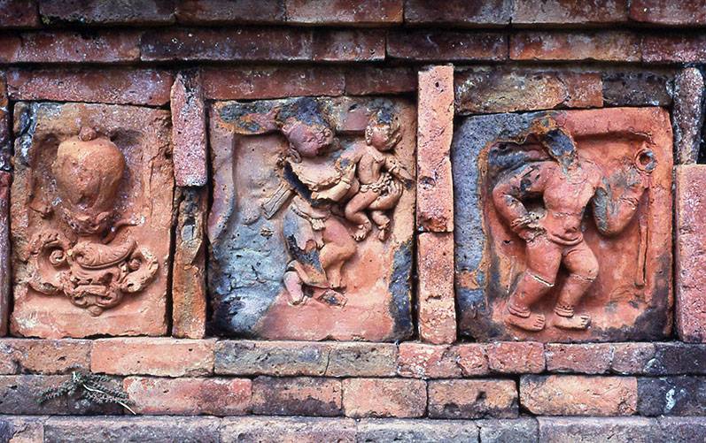 パハ-ルプルの ソ-マプラ大僧院の大祠堂の 基壇の壁面を飾るテラコッタ・パネル 一枚一枚が枠取りされていながら、漁師や魚が枠から はみ出すように描かれている。 粘土が生乾きのうちに 素早く彫刻をするので、表現は大づかみで 躍動感に満ちている。
