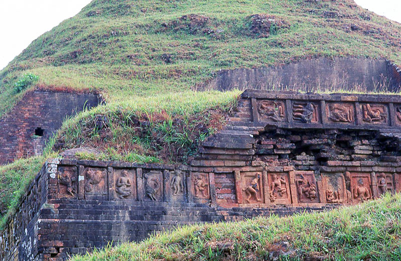 パハ-ルプルの ソ-マプラ大僧院の大祠堂 壁面 中央の大寺院の壁面は テラコッタ・パネルで飾られていた。 北西コーナーの壁面、明るい色のパネルはレプリカ。 左から7番目のパネルは作成中( 本物は博物館 )