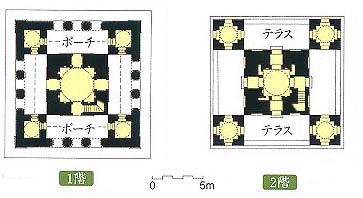 屋根の軒線が水平でな くカーブを描き、四隅が垂れ下がっているのが 目を引くが、これは雨の多いこの地方において 雨を早く地上に流れ落とさせるための、農家の草葺き屋根の形からきている。このベンガル風の曲面屋根(バンガルダール屋根)が、ムガル朝によってデリーや アーグラにもたらされ、さらに それが西インドのラージプート諸国に伝えられたので、前々回紹介した ジャイサルメルの石造ハヴェリーでも、それが極端な形で 出窓などに用いられていたのである。