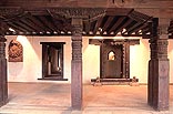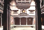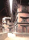 町の一番古い地区は、王宮地区であるよりも、ダッタトレーヤ寺院のある タチャパル・トル(広場)周辺である。ここにはマッラ朝の建築伝統を伝える 多くの木造建築が残り、それらのファサードや、中庭に面した窓やドア廻りの華麗な木彫が、今も燦然と輝きを放っている。一昔前には、近代化の波に取り残されたこの町はかなり荒廃し、建物は崩れ、町は汚物に満ちていた。それを今のように美しく甦らせたのは ドイツとユネスコの援助による 1970年代後半から 80年代初めにかけての 修復と保存活動によるところが大きい。建築家や大学の研究室グループが 町や建物を実測し、復原図を起こし、道や広場を舗装し直し、建物を改修して 新しい用途に適合させるなどして、この町全体を博物館都市のように よみがえらせたのである。私が初めてこの町を訪れたのは 1976年のことであったから、そのプロジェクトが始まった頃であったが、1991年に再訪した時には どこも驚くほど美しく整備されていて、その落ち着いた佇まいが、カトマンドゥやパタンの商業化した騒がしさとは 著しい対照を見せていた。