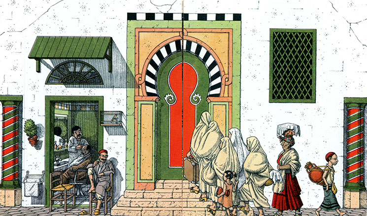 チュニス旧市街の、ハンマーム入口の絵(チュニジア) 日本の理髪店のような、斜めストライプ模様の柱(バーバー・ポール)が 両脇に立つ。 ( From "La Medina de Tunis" by Bruno Fourure, 1956, Alif ) 実際のチュニス旧市街(メディナ)の、ハンマーム入口前の通り