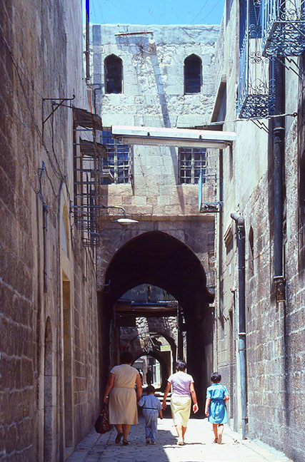 アレッポの ジュダイダ地区の、家々の石壁で囲まれた 通り。