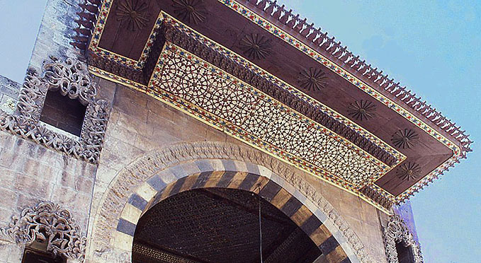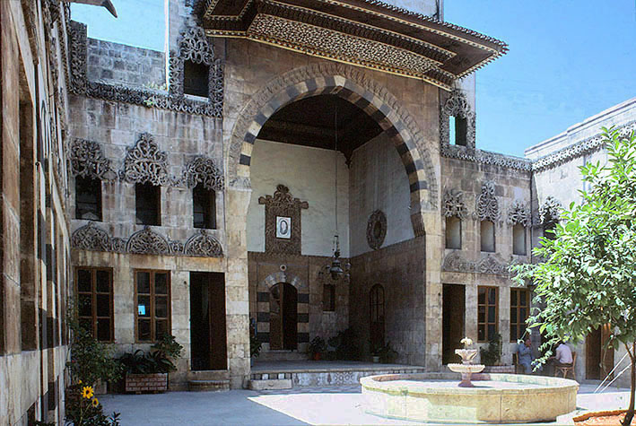 アレッポのアルメニア人地区の中庭住居 アチクバシュ邸 (Bayt Ajiqbash) 1757年創建 現在は「伝統文化博物館」として用いられている。 中庭には噴泉を設け、イーワーンの上には 木造の庇を出し、 窓の上には 石造の組み紐飾りを付けるのが 定石。 アチクバシュ邸、イーワーンの上の木造の庇の 軒裏詳細