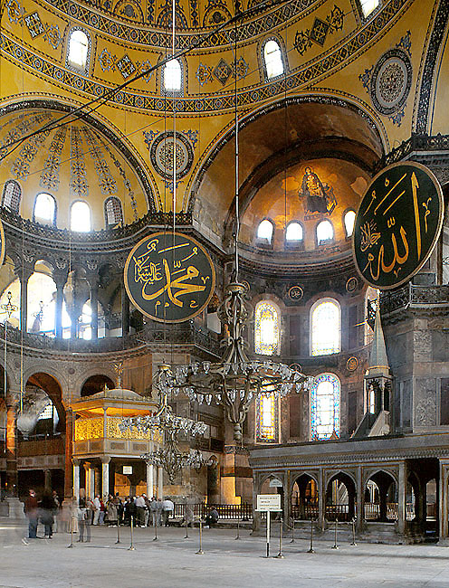 聖ソフィア大聖堂の 東側アプスを見る。 アプスの上部の半ドームに、金地モザイクで 聖母子像が描かれている。 左側の半ドームは、その上部の 大 半ドームを支える半円突起 (エクセドラ)。 その下の二層の小堂は、スルタンの礼拝場所。 右下はディッカ (応唱台)、その奥に トルコ型のミンバル (説教壇) が見える。