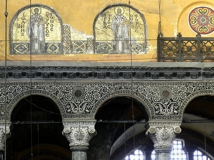 2階の北側柱廊のアーケード装飾 および柱頭と、上部の 聖人のモザイク壁画