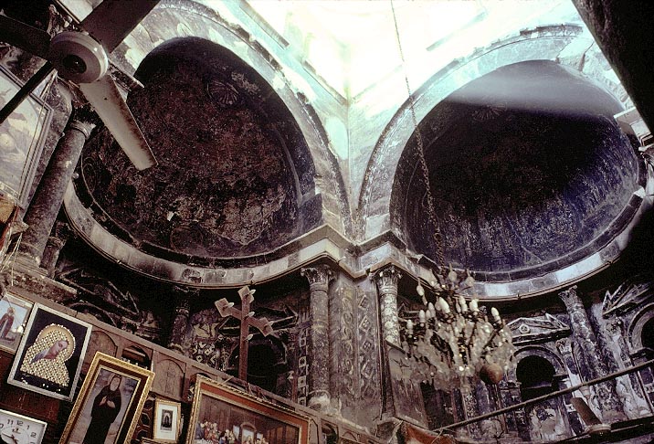 3つのアプスが向かい合う トリコンク(三葉形)の内陣見上げ、ソハーグの赤修道院。