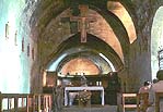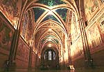 一方、建築史上に残る有名な宗教建築には、国家の財力や権力を基盤として作られたものが少なくない。それらは偉大ではあっても、本来の宗教的情熱とは遠いものであることが多い。では、本来の宗教建築とは どのようなものであったかと考えると、教団の初期において、その信者や聖職者たちが セルフビルドで建てたような施設であったろう。どんなにみすぼらしく見えようと、そこには純粋な宗教心の発露があったにちがいない。しかし、そうした建物は 建築的な成熟度が低いので、建築作品とは見なしにくいし、後世に残ることも少ない。そして財や物質性を徹底的に否定すれば、究極的には 建物は不要ということにもなる。 サン・フランチェスコ聖堂とサン・ダミアーノ 聖堂の内部の比較
