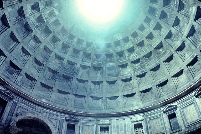 パンテオンのドーム天井。 内法の直径は 44m。 天窓の直径は 9mで、ガラスは無いので雨が落ちる。 The dome of the Pantheon with a diameter of 44m. The sky-light with a diameter of 9m has no glass, letting rain fall.