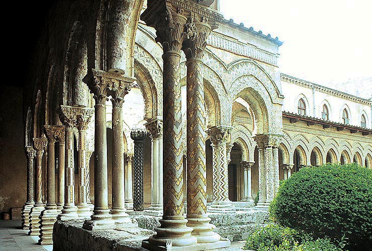 広いキオストロ(クロイスター)の回廊と噴泉室。