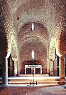 私は回廊の屋上に出て、そこから上の聖堂の内部へと入った。その時、この単純素朴な、ただ ミサのために祭壇と照明が整えられただけの内部空間の、あまりの美しさに 息を呑んだのである。盛期ロマネスクの聖堂に比べて、ここにはほとんど何の装飾もなく、石も精巧な切石ではなく、野石や、せいぜい割り石にすぎない粗い石をモルタルによって積み重ねたにすぎず、刳形ひとつない、まことに簡素な建物である。ただ アーケードを支える柱だけが、ラフに磨かれた単岩の円柱で、その柱頭には まるで線描のような、申しわけ程度の彫刻があるにすぎない。それにもかかわらず、私がそれまで見た いかなるキリスト教聖堂よりも ここは美しく、私の魂を震撼させたのである。