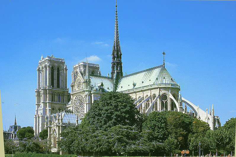 パリのノトル・ダーム大聖堂を背後の公園から見る。